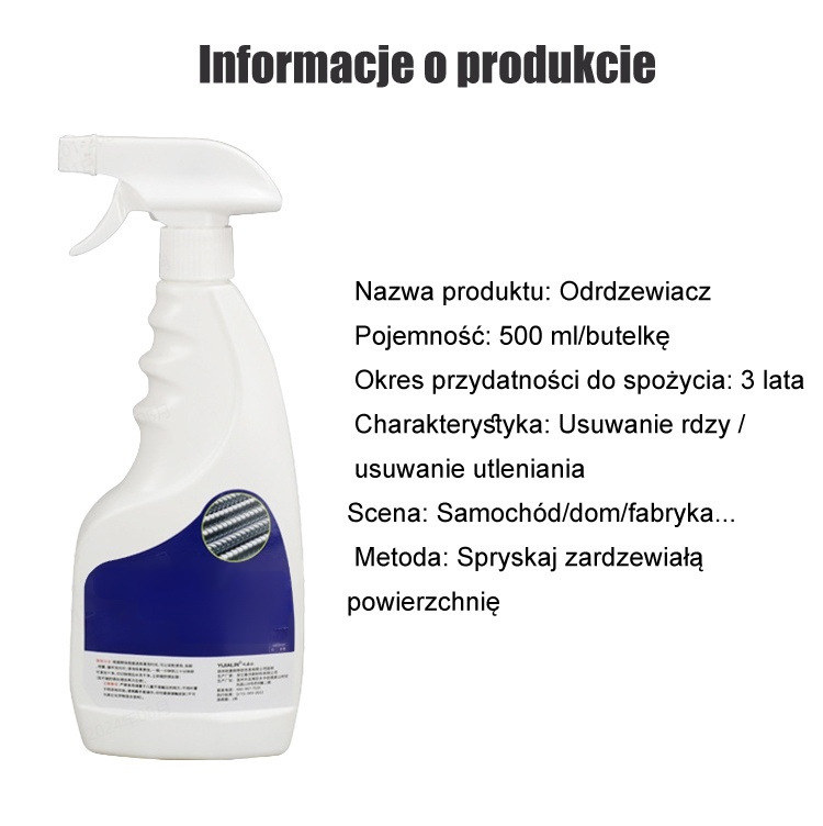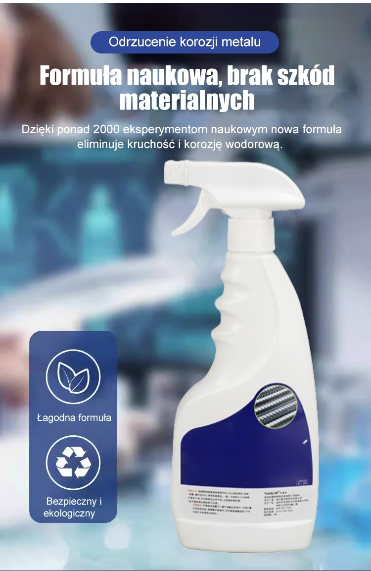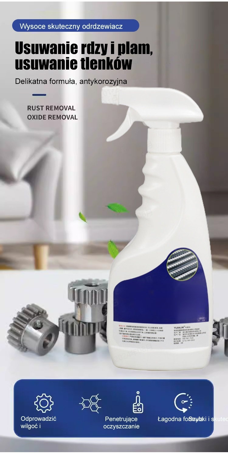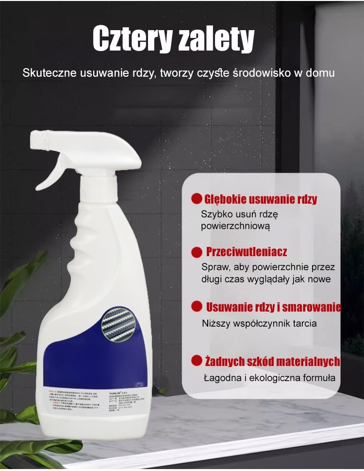 Usuwa rdzę w 3 sekundy, sprawiając że metal wygląda jak nowy; nie rdzewieje przez 50 lat, nietoksyczny i bezzapachowy.
